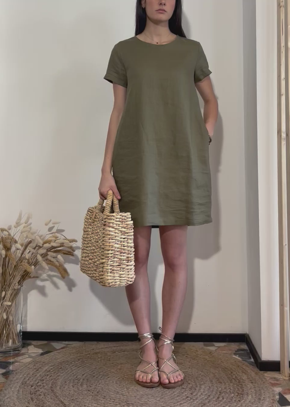 Abito corto a maniche corte e un delicato scollo ovale impreziosito da una chiusura a goccia sul retro. Un modello semplice e funzionale, pensato per accompagnarti con stile nelle giornate più calde. Realizzato in fresco lino color oliva, è leggero e piacevole sulla pelle. Le tasche laterali lo rendono ancora più comodo e pratico, senza rinunciare all’eleganza. Perfetto con un sandalo per un look estivo essenziale, oppure con una sneaker per un tocco più casual e quotidiano.