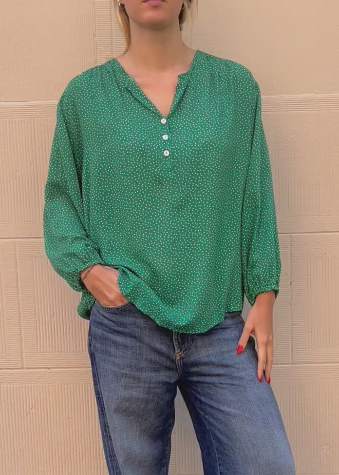 Camicia verde smeraldo con pois bianchi in viscosa super leggera, un tessuto che ti avvolge con freschezza e comfort. I bottoncini in madreperla aggiungono un tocco di raffinatezza. La manica morbida con elastico sul polso conferisce un tocco di femminilità e stile. Un capo perfetto per un look estivo fresco e sofisticato.